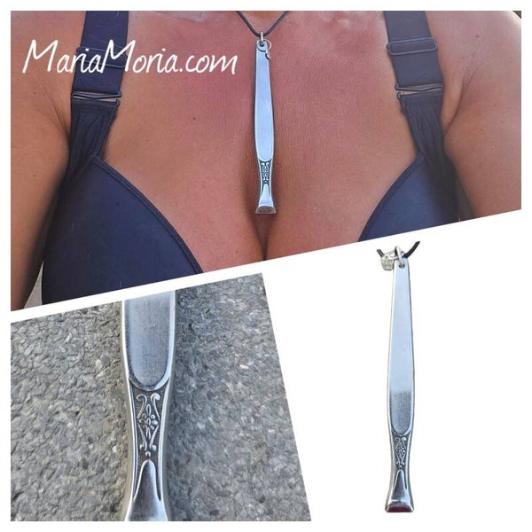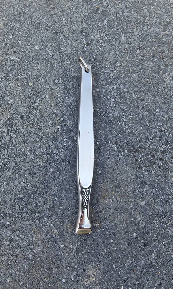 Betty. Langwerpige hanger met bewerkt onderstuk. Ongeveer 12.4 cm lengte.
