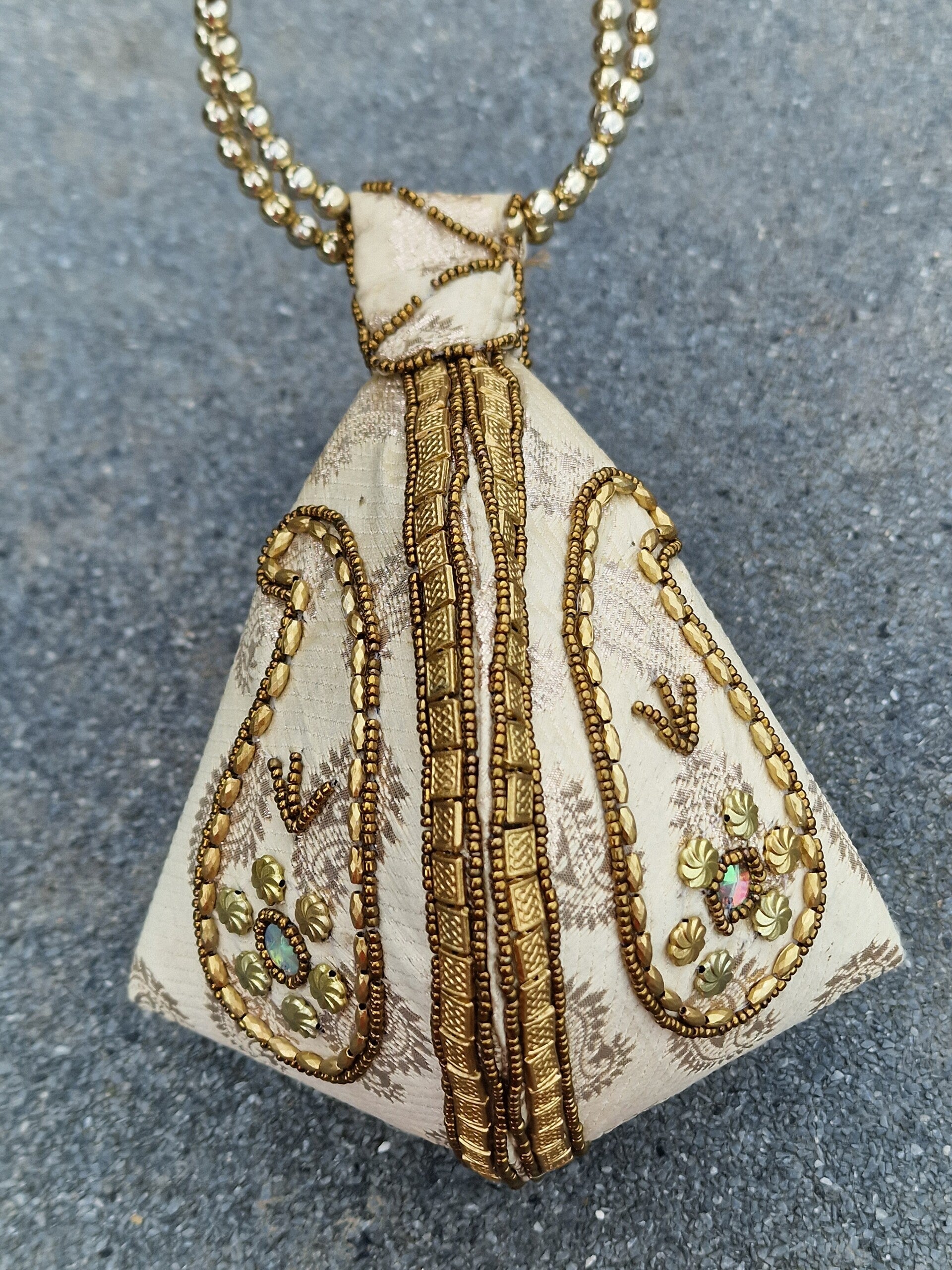 De tas is met kralen geborduurd en heeft een kralen handvat die een klein beetje buigbaar is.