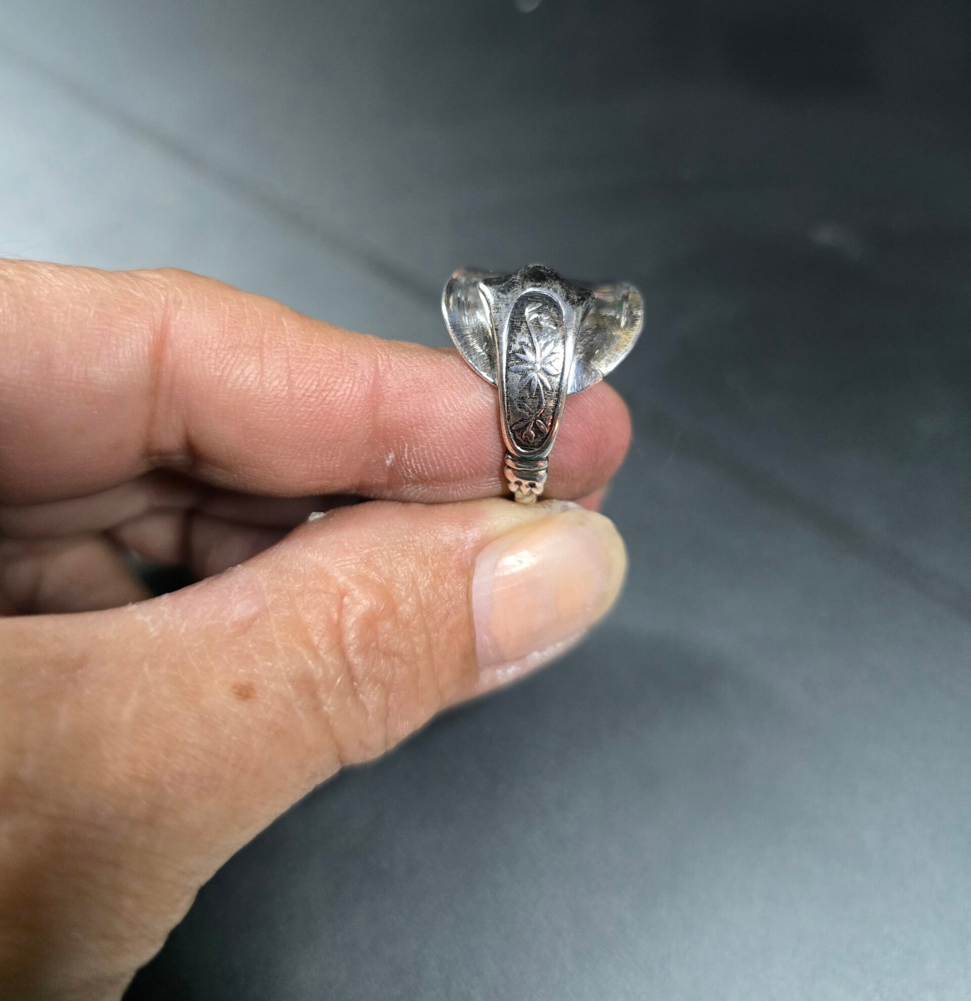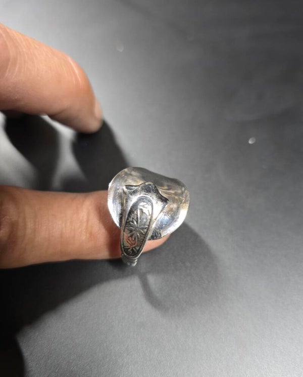 De bewerking op de hendel is erg mooi en subtiel. Nadat de ring gepolijst is, is hij shiney en klaar voor gebruik. Je krijgt er een micro doekje bij maar de bedoeling is niet om hem keer op keer te poetsen ondanks dat het zilver is. De ring zal heel lang sniney blijven, het is dus ook niet nodig.
